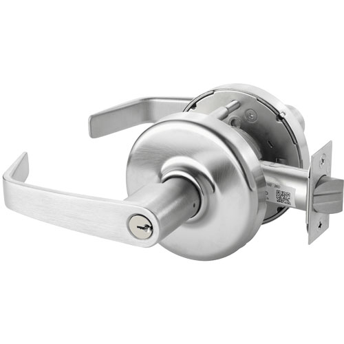 Corbin Russwin CLX3351 NZD Entrance or Office Lever Lock Grade 1 - ANSI F109 - Deadlocking latchbolt by lever either side, except when turn button locks outside lever. Pushing turn button in locks outside lever, requiring use of key outside to unlock. (Lever handle is freewheeling in locked position.) Turning inside lever unlocks outside lever. Pushing in and turning button locks outside lever, requiring key at all times. Turning inside lever does not unlock outside lever until button is manually turned to unlocked position. Inside lever always free.